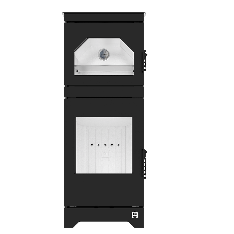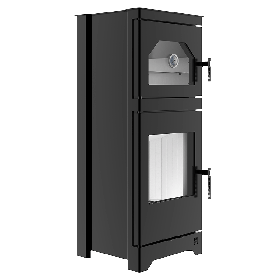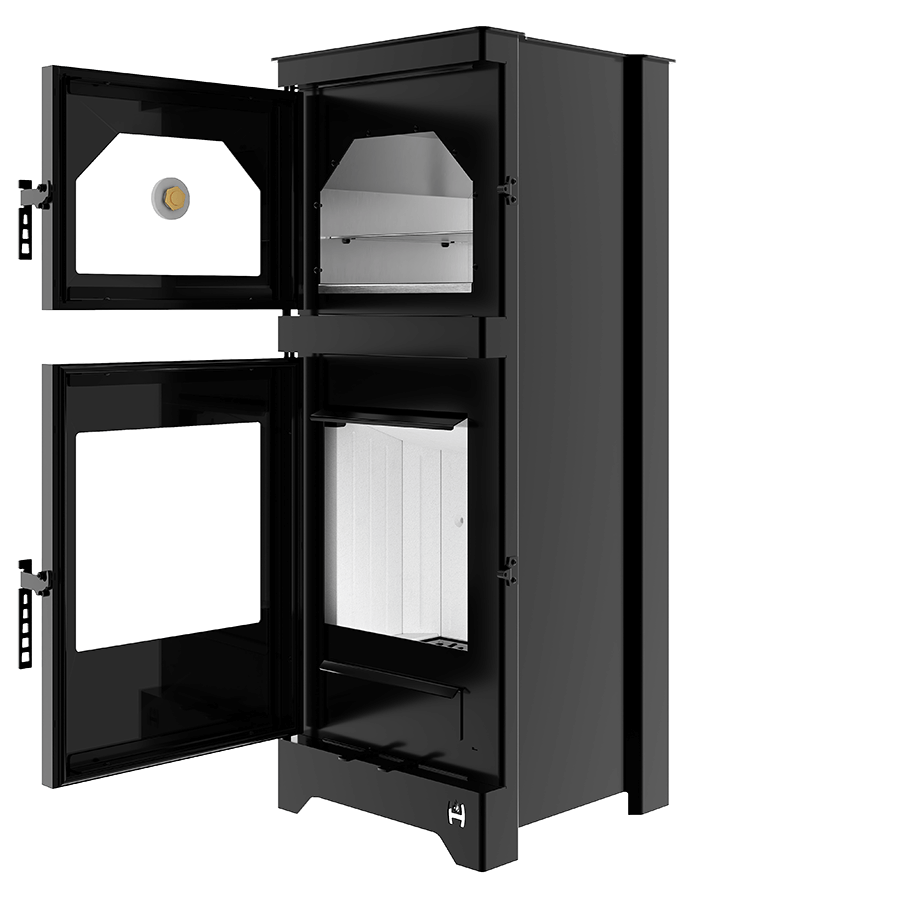Der freistehende Herd LYNX O ist mit einer hochwertigen Hochtemperaturfarbe beschichtet, die das Blech vor äußeren Einflüssen schützt und der Feuerstelle ein elegantes und ästhetisches Aussehen verleiht. Dieses Modell ist auch mit dekorierter DECOR-Kaminkeramik ausgestattet. Die geschliffene Kaminverglasung mit beidseitigem Luftschleier behält ihre Transparenz auch bei Temperaturen bis 800°C. Der über dem Feuerraum angeordnete Backofen ist ein zusätzliches Merkmal, das gleichzeitiges Backen und Heizen ermöglicht. Das Innere des Backofens ist aus rostfreiem Stahl und garantiert Langlebigkeit und leichte Reinigung.