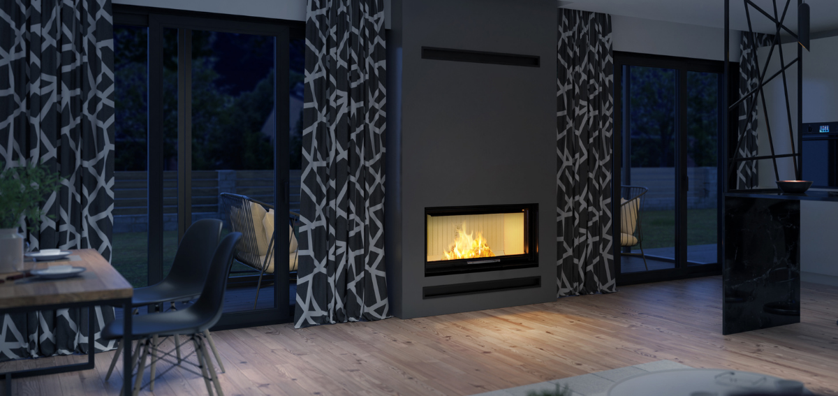 Tiefe Brennkammer. Eine neue Art von Guillotine. Erhöhte Masse für größere Wärmespeicherung. Kaminofeneinsatz geeignet für Wärmerückgewinnung.